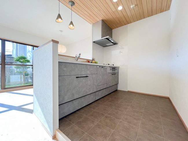 キッチンは、リビングとダイニングを見渡すことが出来、天井を板張りにすることでちょっとした特別な空間を演出しています。