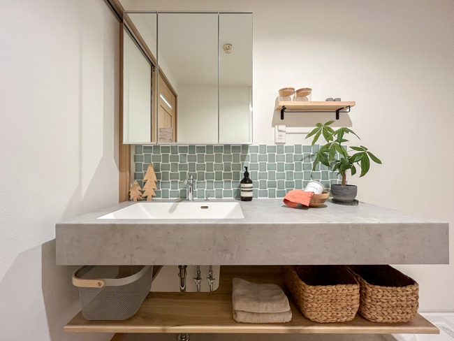 洗面台の正面にアクセントタイルを貼ることで、見た目も機能性も兼ね備えた作りになります。