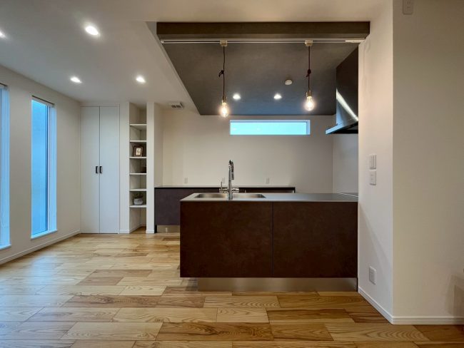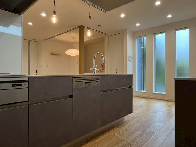 お施主様のご希望は「コンロ前に壁のないフロートキッチン」。