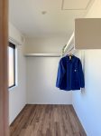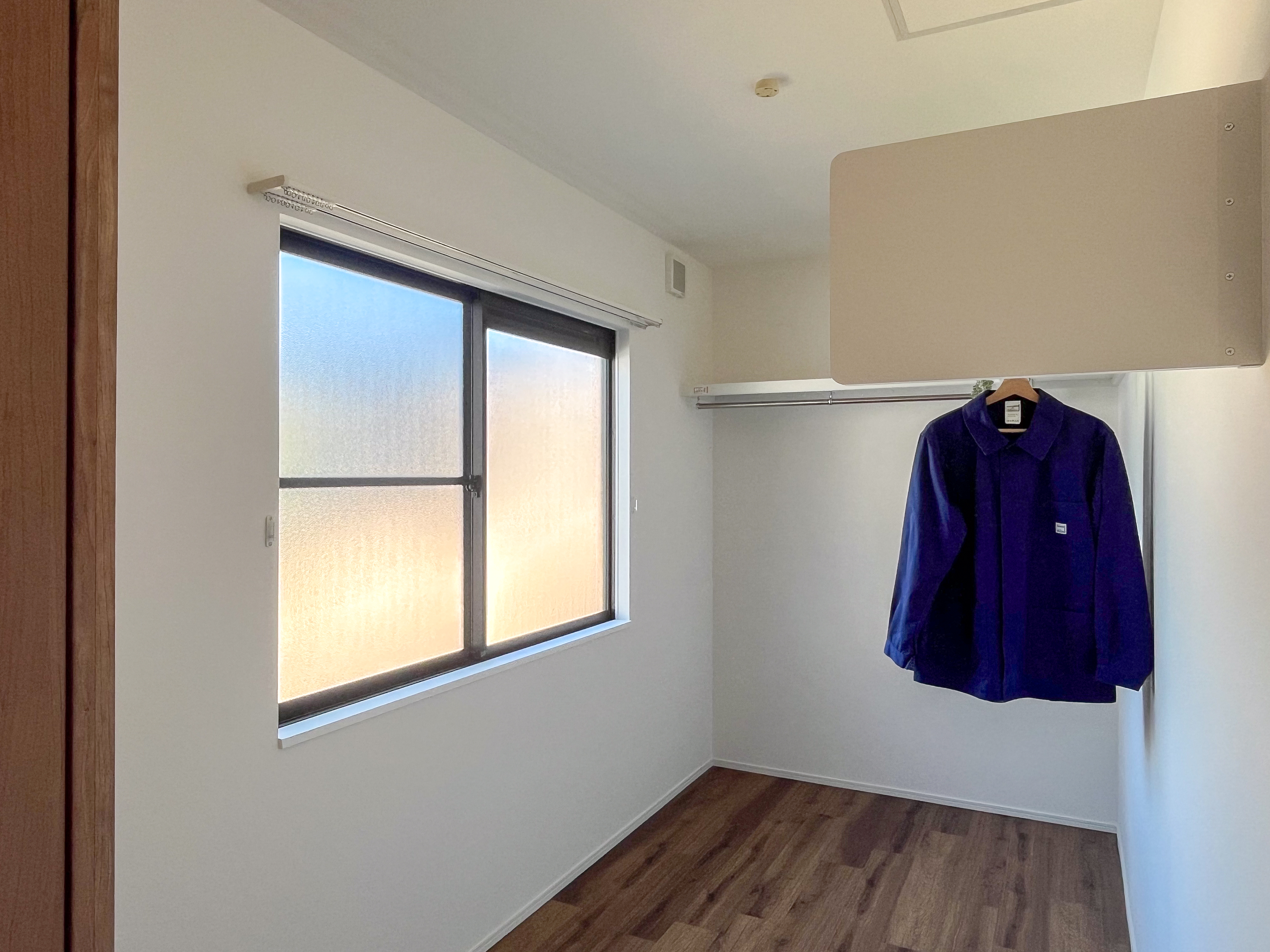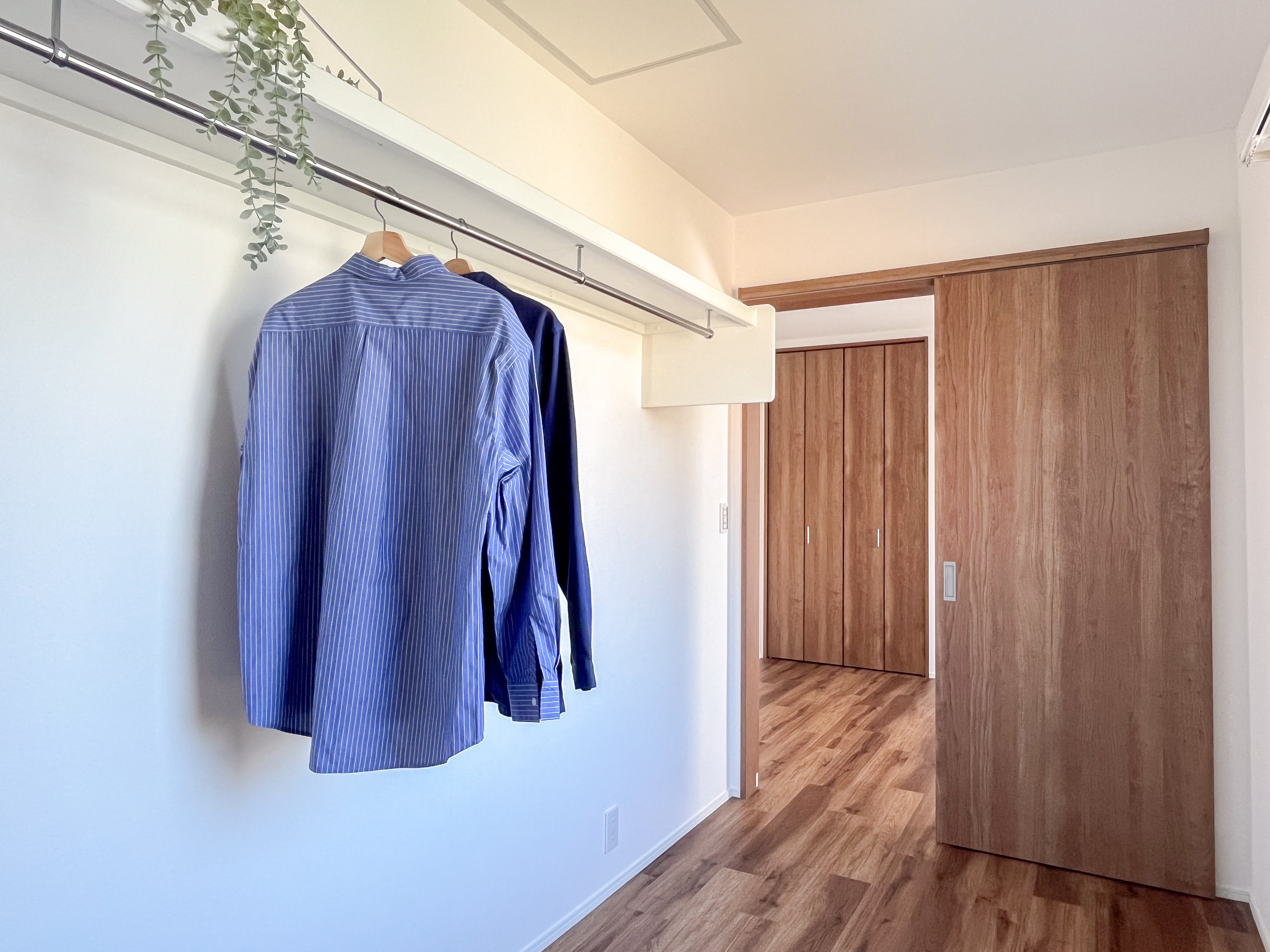 2階のフリースペースは、棚とハンガーパイブを新設して、ウォークインクローゼットとして有効活用。