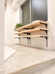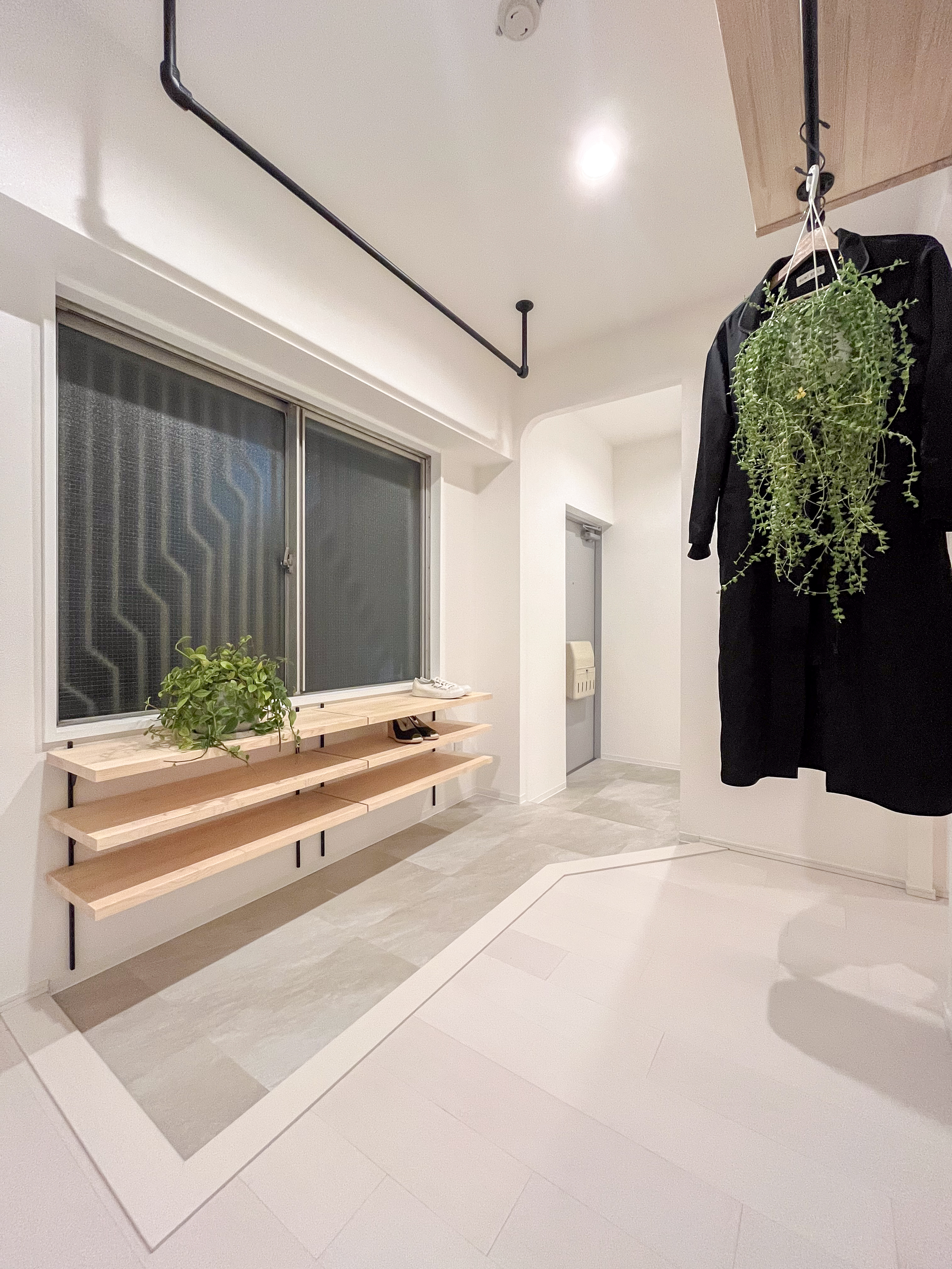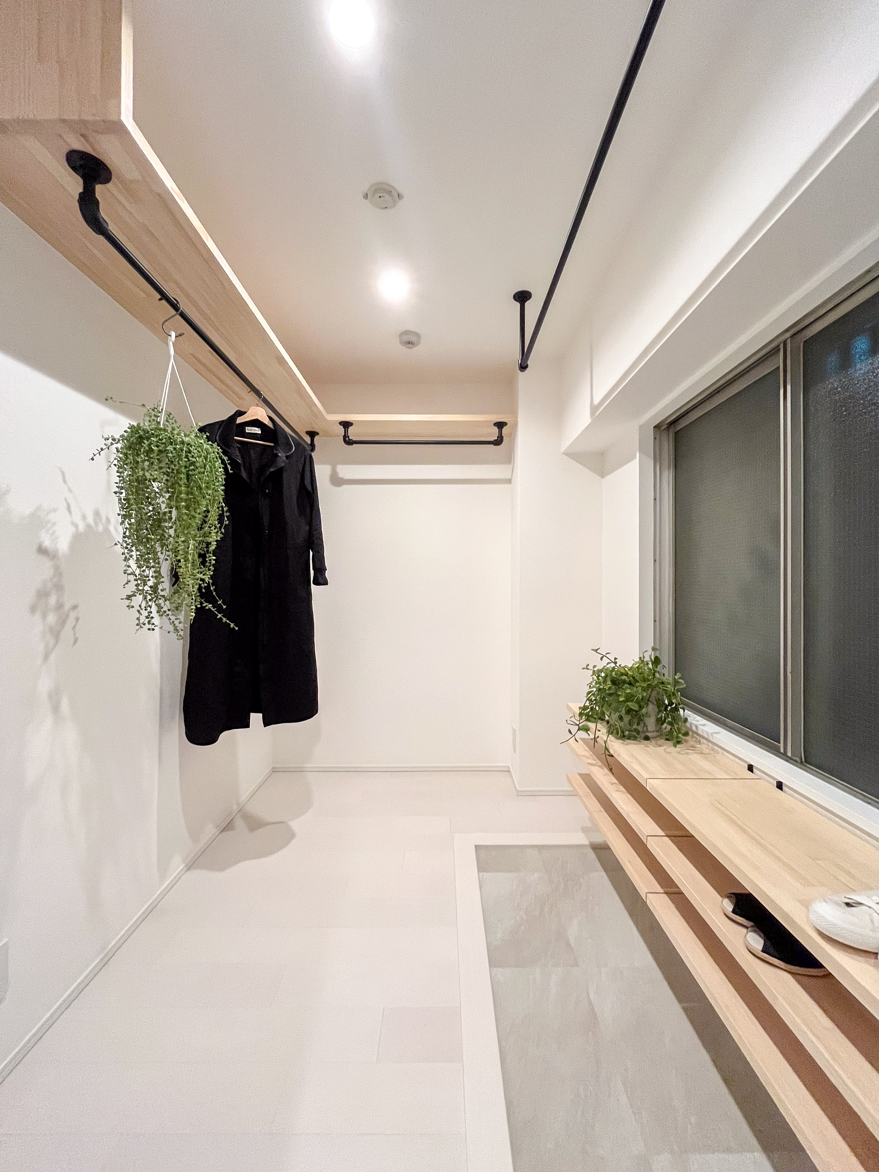 土間収納には、枕棚+ハンガーパイプの組み合わせを造作で設置しました。