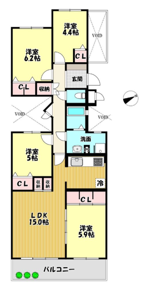 | 間取り | 3LDK | 間取り内訳 | 洋6.2畳×1室 洋5.9畳×1室 洋5畳×1室 洋4.4畳×1室 LDK15畳×1室 |