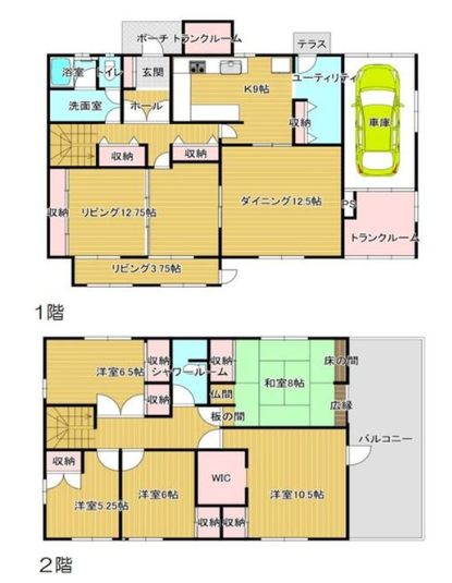 | 間取り | 5LDK | 間取り内訳 | 1FLDK34畳 2F和8畳×1室 2F洋10畳×1室 2F洋6畳×2室 2F洋5.2畳×1室 |
