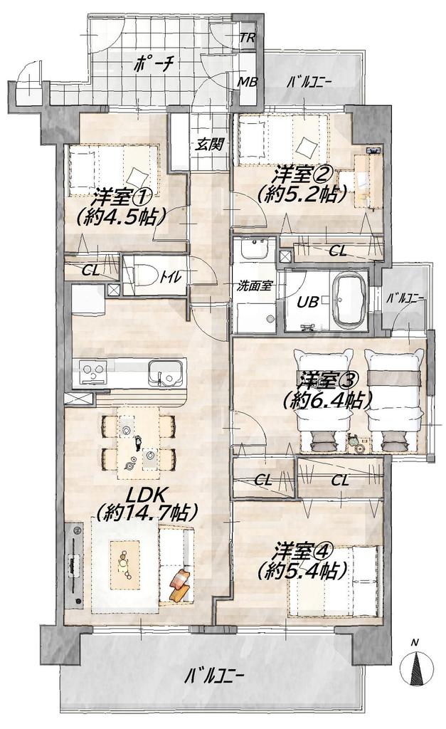 | 間取り | 4LDK | 間取り内訳 | LDK14.7畳×1室 洋4.5畳×1室 洋5.2畳×1室 洋5.4畳×1室 洋6.4畳×1室 |
