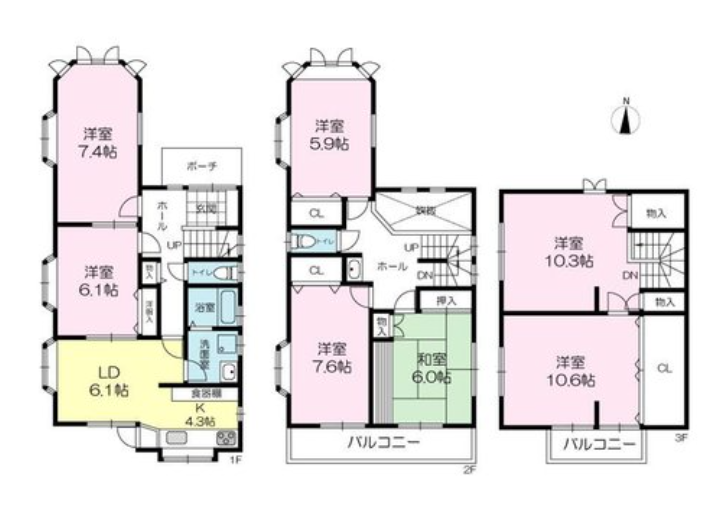 | 間取り | 7LDK | 間取り内訳 | 1FLDK10.4畳×1室 1F洋6.1畳×1室 1F洋7.4畳×1室 2F洋7.6畳×1室 2F洋5.9畳×1室 |