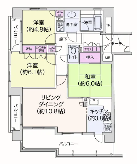 | 間取り | 3LDK | 間取り内訳 | LDK14.6畳×1室 洋6.1畳×1室 洋4.8畳×1室 和6畳×1室 |