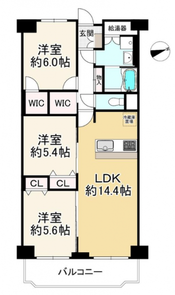 間取り | 3LDK | 間取り内訳 | 洋6畳×1室 洋5.6畳×1室 洋5.4畳×1室 LDK14.4畳×1室 |
