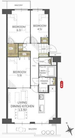 | 間取り | 3LDK | 間取り内訳 | 洋6.3畳×1室 洋5.9畳×1室 洋4.5畳×1室 LDK13.9畳×1室 |