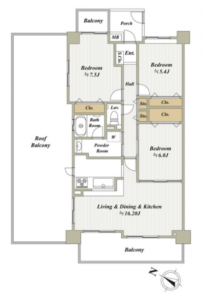 | 間取り | 3LDK | 間取り内訳 | 6FLDK16.2畳×1室 6F洋7.5畳×1室 6F洋6畳×1室 6F洋5.4畳×1室 |