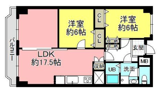 | 間取り | 2LDK | 間取り内訳 | 洋6畳×2室 LDK17.5畳×1室 |