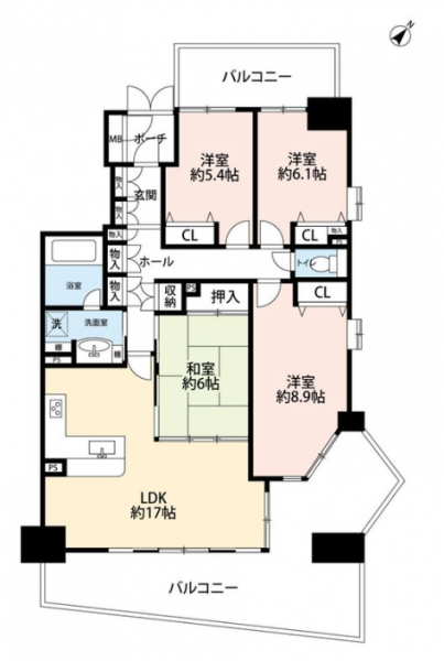 | 間取り | 4LDK | 間取り内訳 | LDK17畳×1室 洋8.9畳×1室 洋6.1畳×1室 洋5.4畳×1室 和6畳×1室 |