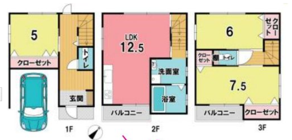 | 間取り | 3LDK | 間取り内訳 | 1F洋5畳×1室 2FLDK12.5畳×1室 3F洋7.5畳×1室 3F洋6畳×1室 |