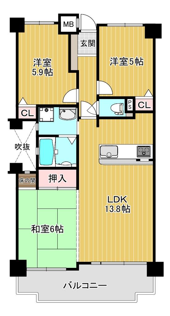 | 間取り | 3LDK | 間取り内訳 | LDK13.8畳×1室 洋5.9畳×1室 洋5畳×1室 和6畳×1室 |