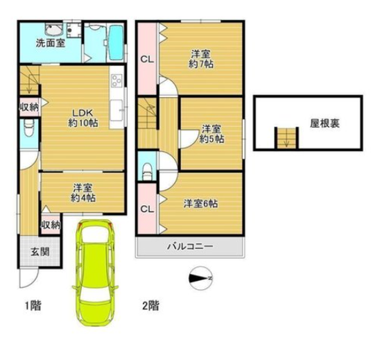 | 間取り | 4LDK | 間取り内訳 | 1FLDK10畳×1室 1F洋4畳×1室 2F洋7畳×1室 2F洋6畳×1室 2F洋5畳×1室 |