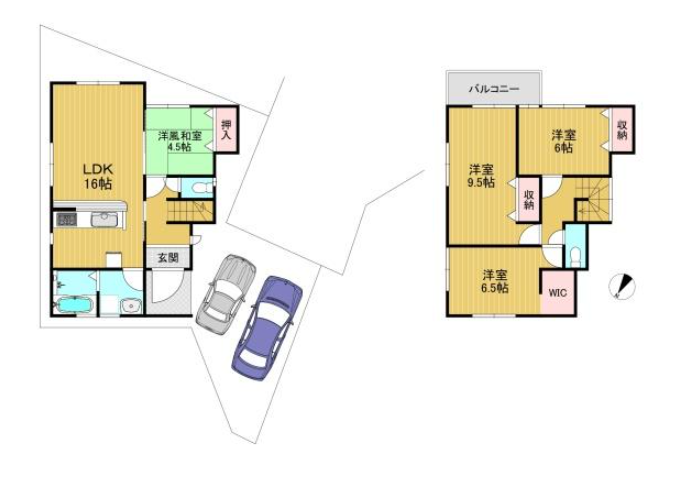 | 間取り | 4LDK | 間取り内訳 | 1FLDK16畳 1F和4.5畳 2F洋9.5畳 2F洋6.5畳 2F洋6畳 |
